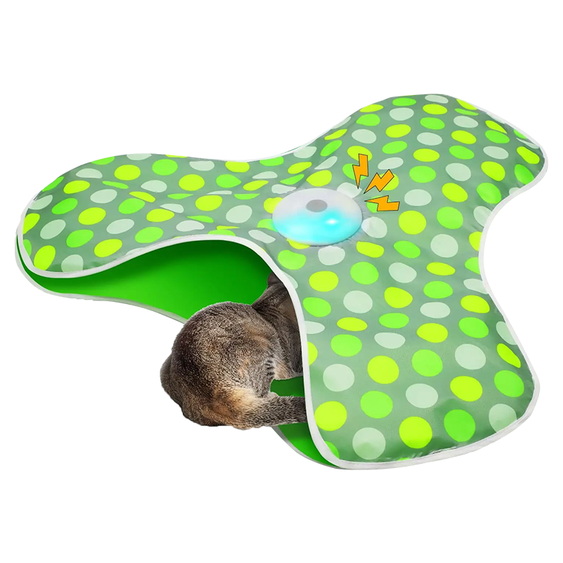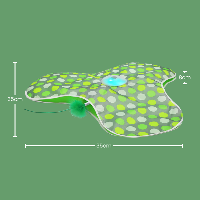 The toy uses a rotating feather that hides and reappears under the fabric cover — creating an interactive, chase-style game that mimics real prey movement.