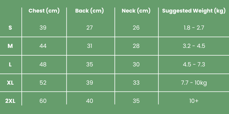 | Size | Chest (cm) | Back (cm) | Neck (cm) | Suggested Weight (kg) |